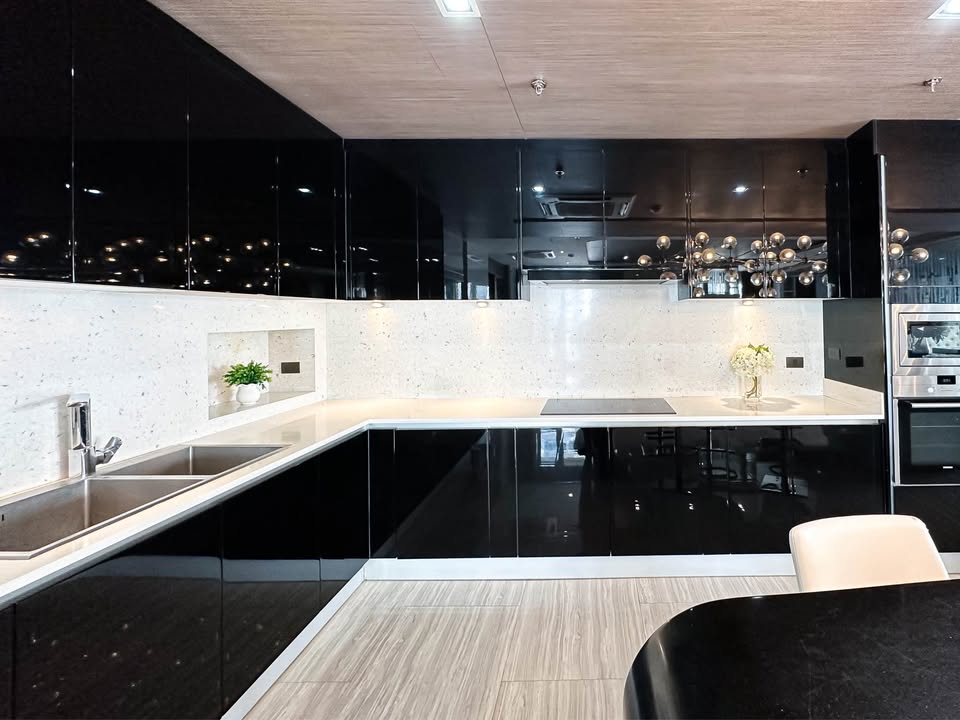 ครัวเปิดพร้อมบาร์ + อุปกรณ์ครบ: ตู้เย็น เตาไฟฟ้า ไมโครเวฟ เตาอบ